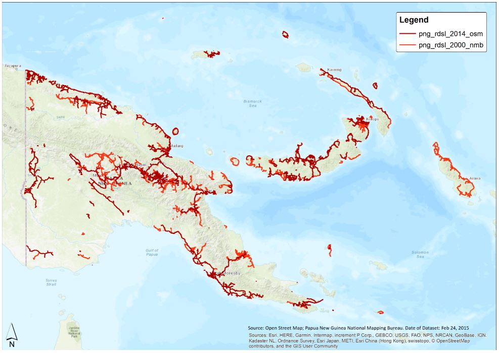 Map showing the PNG roads 2014 - Open Street Map dataset and the PNG roads 2000 - National Mapping Bureau dataset.